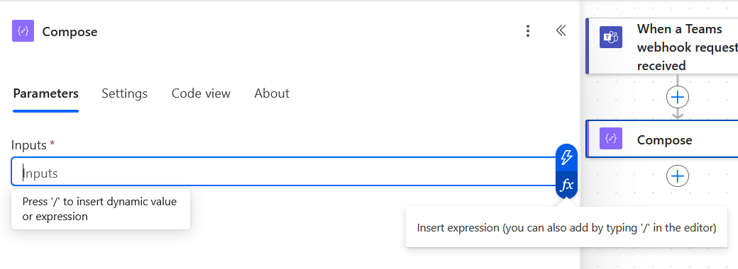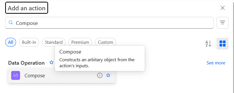 - Legen Sie die erste Aktion an. Suchen Sie dafür nach "Verfassen" nutzen die gleichnamige Aktion aus der Gruppe "Datenvorgang".