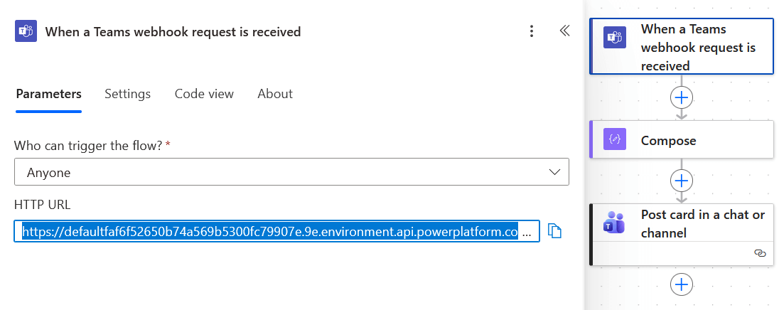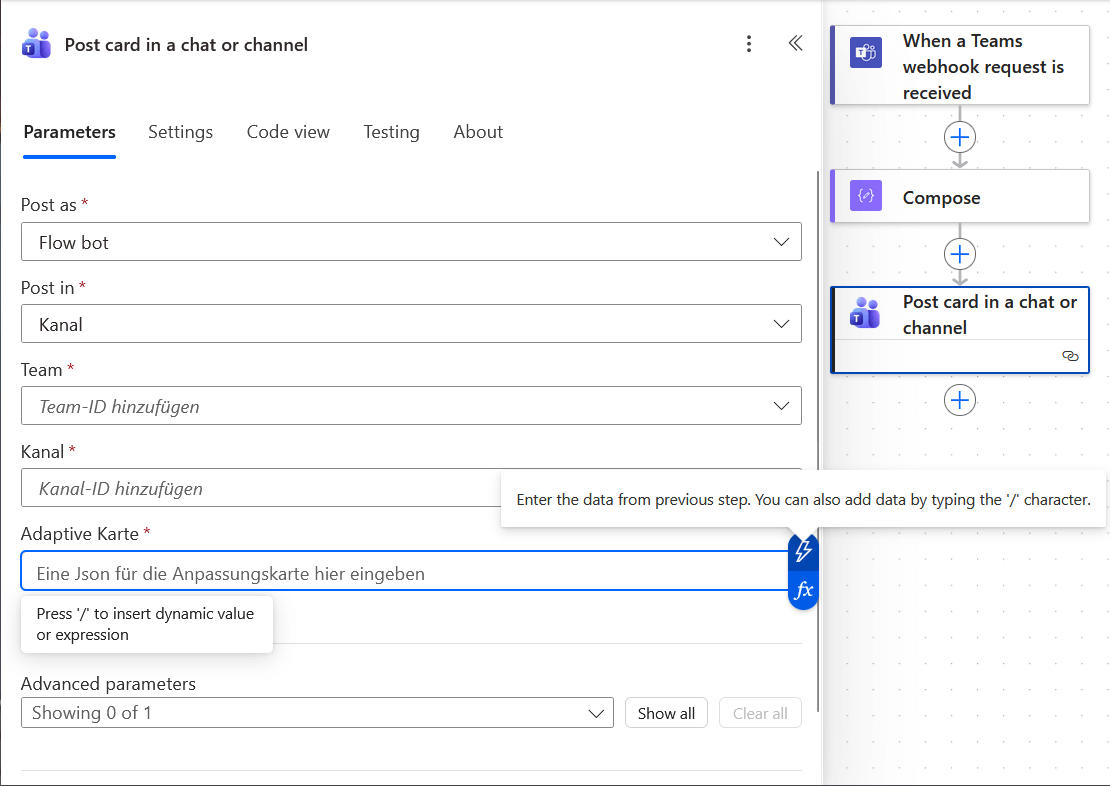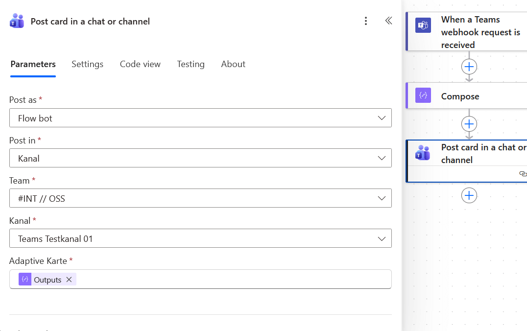 - Erstellen Sie die Aktion "Karte in einem Chat oder Kanal veröffentlichen" aus der Gruppe "Microsoft Teams".