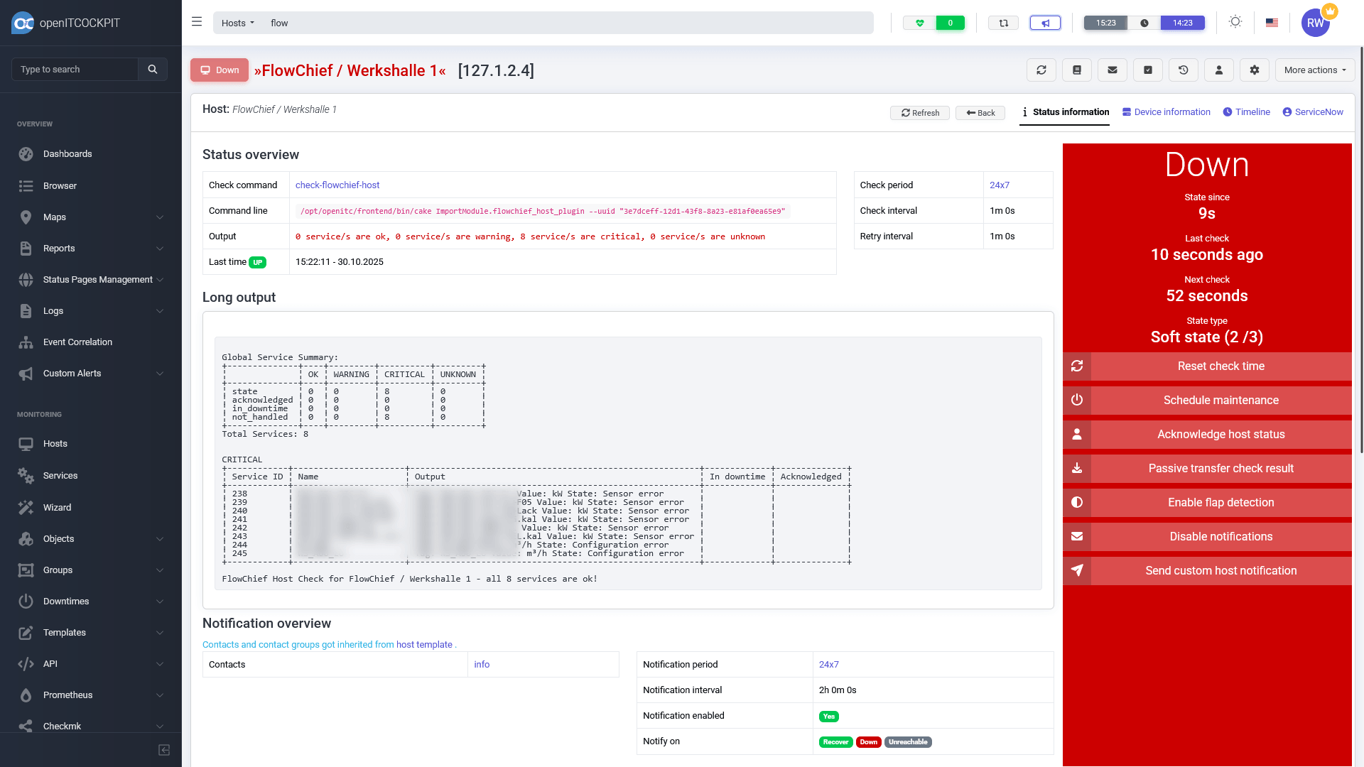 Aktive Alarme werden in openITCOCKPIT im Longoutput des Hosts angezeigt und können je nach Konfiguration den Hoststatus auf "Down" wechseln.