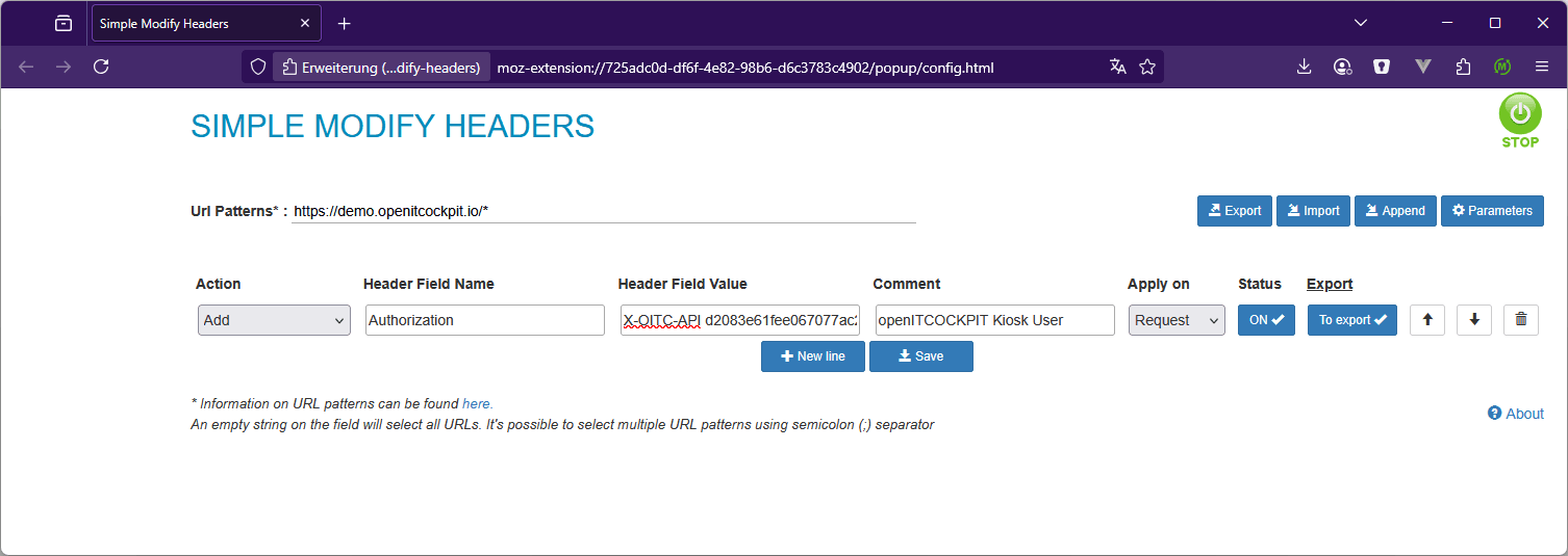 In the next step, install the browser extension SimpleModifyHeaders on your kiosk system. The SimpleModifyHeaders browser extension will add the API key to all requests done by the browser automatically, so openITCOCKPIT will no longer ask for any login credentials.