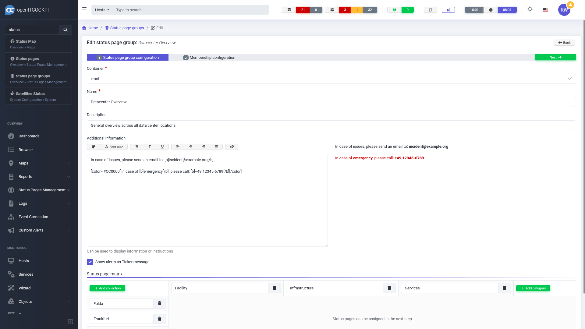 Optional können Sie der Statusseiten-Gruppe einen Freitext hinzufügen. So können Sie nützliche Informationen wie Telefonnummern, Links zu einem Wiki oder andere relevante Details hinterlegen.
