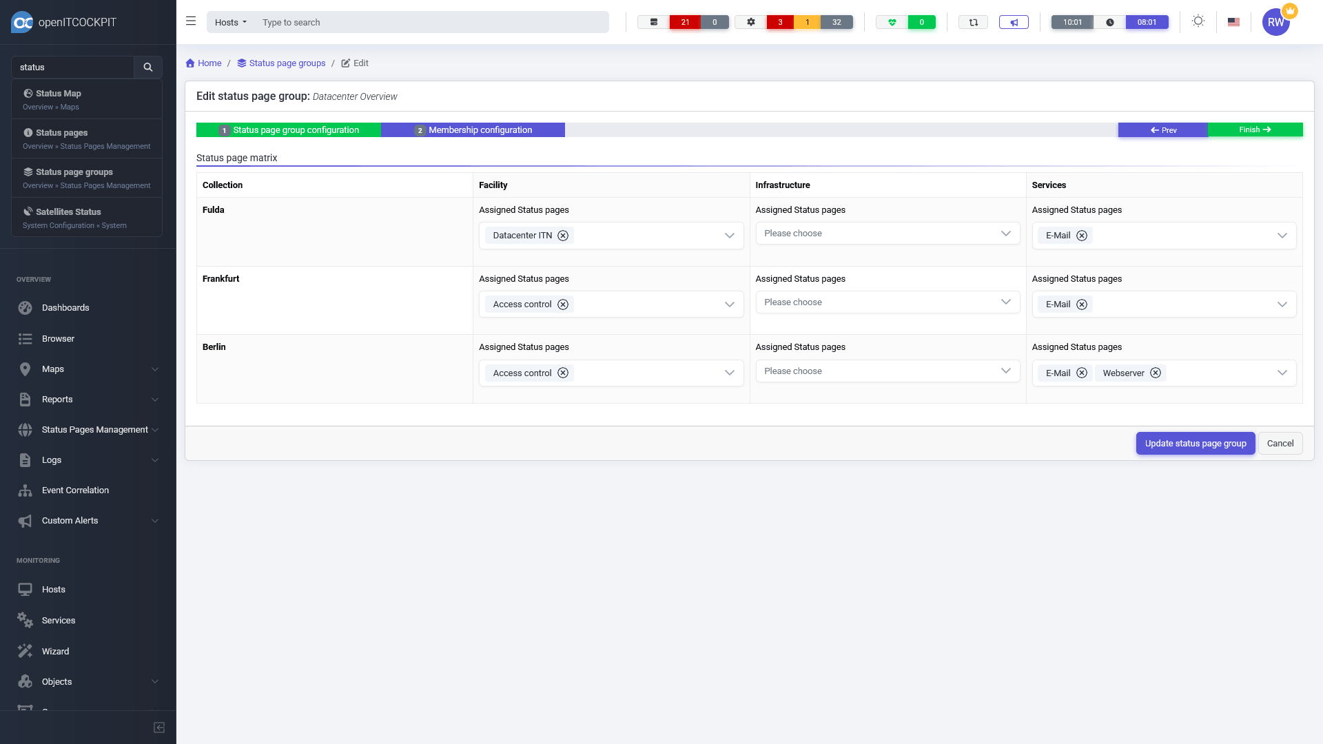 Die Erstellung neuer Statusseiten-Gruppen erfolgt in zwei Schritten. Im ersten Schritt definieren Sie die Statusseiten-Matrix.