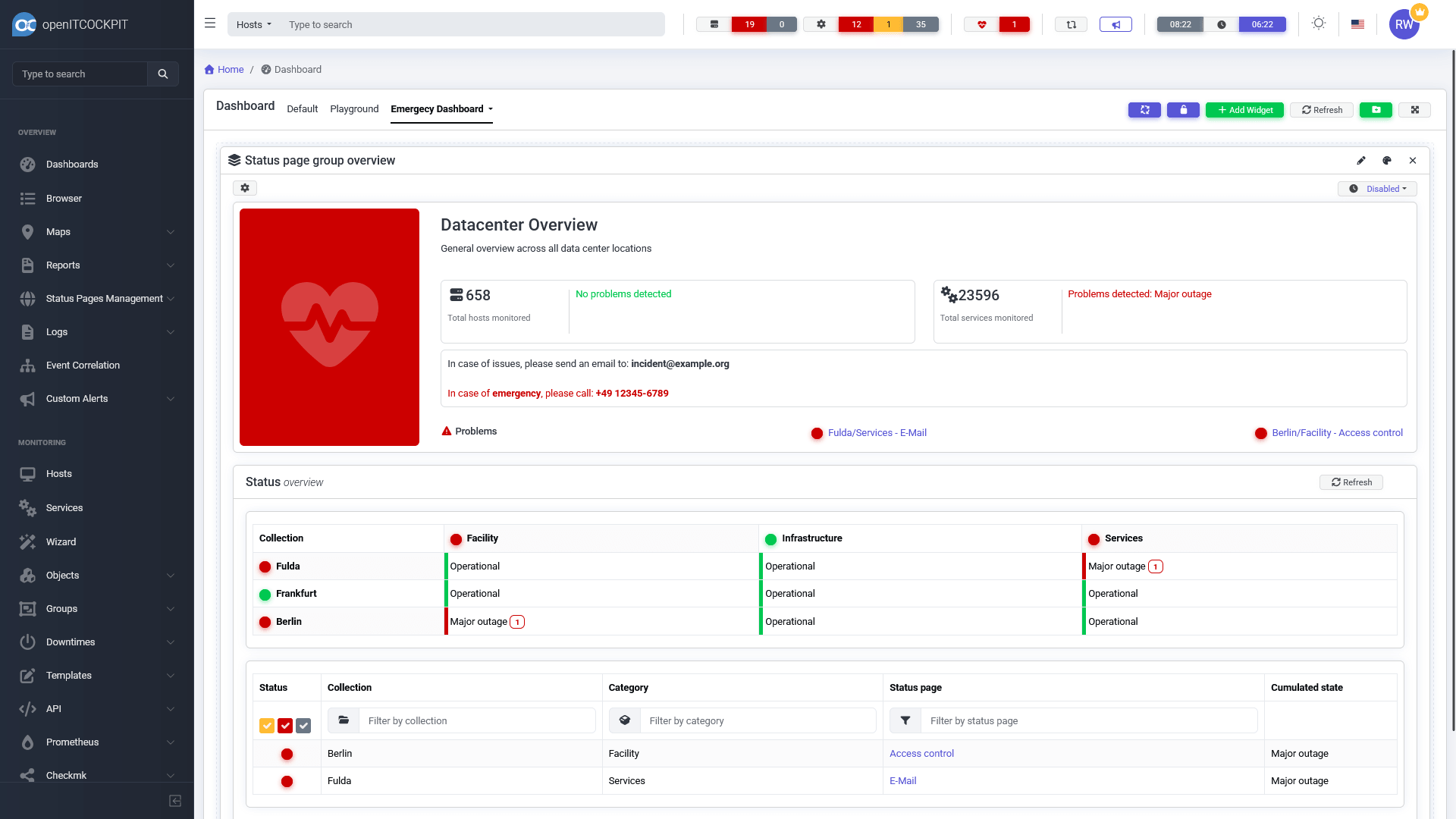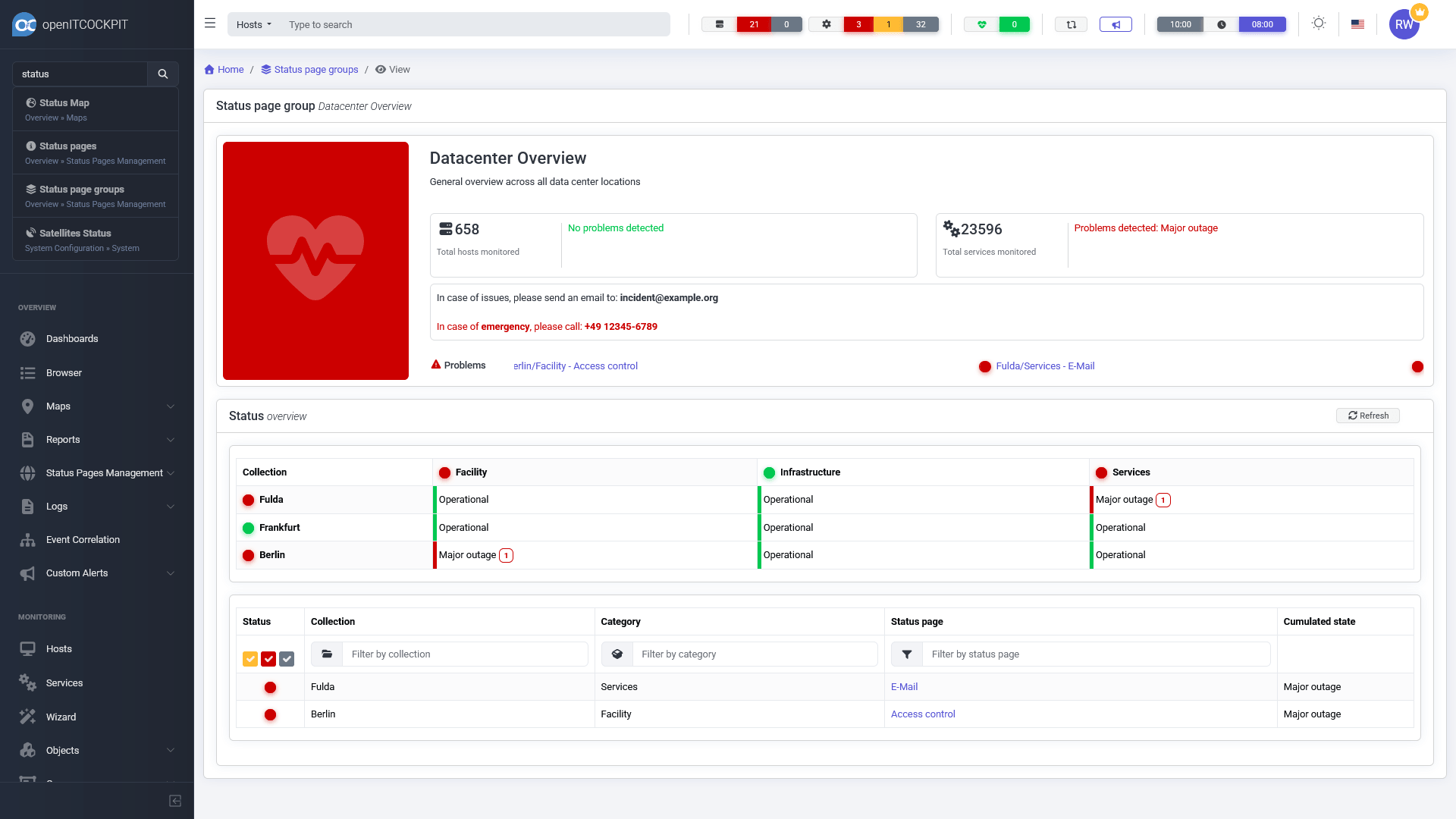 openITCOCKPIT berechnet den Status jeder Zelle in einer Statusseiten-Gruppe, indem alle zugewiesenen Statusseiten ausgewertet werden und der schlechteste Status übernommen wird – dies ist als „Worst State Wins“-Prinzip bekannt.